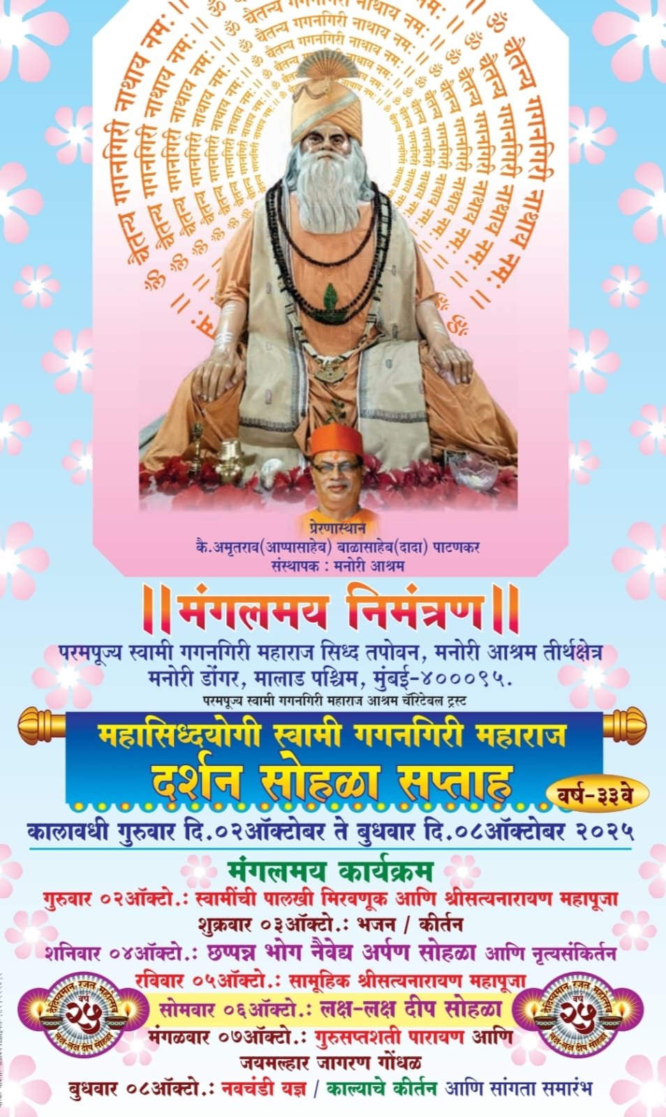 рейреи рд╡рд╛ рдорд╣рд╛рд╕рд┐рджреНрдзрдпреЛрдЧреА рд╕реНрд╡рд╛рдореА рдЧрдЧрдирдЧрд┐рд░реА рдорд╣рд╛рд░рд╛рдЬ рджрд░реНрд╢рди рд╕реЛрд╣рд│рд╛ рд╕рдкреНрддрд╛рд╣ “рд╡рд┐рд╢реНрд╡рд╢рд╛рдВрддреА рдЖрдгрд┐ рдорд╛рдирд╡рдХрд▓реНрдпрд╛рдгрд╛рдХрд░рд┐рддрд╛” рддрд╕реЗрдЪ рдореБрдВрдмрдИ рд╢рд╣рд░рд╛рддреАрд▓ рдЬрдирддреЗрд▓рд╛ рдирд┐рд╕рд░реНрдЧрд╛рдЪрд╛ рдЖрдирдВрдж рдЖрдгрд┐ рд╕реНрд╡рддрдГрдЪреА рдЕрдзреНрдпрд╛рддреНрдорд┐рдХ, рд╕рд╛рдорд╛рдЬрд┐рдХ, рд╕рд╛рдВрд╕реНрдХреГрддрд┐рдХ рддрд╕реЗрдЪ рдиреИрддрд┐рдХ рдкреНрд░рдЧрддреА рдХрд░рддрд╛ рдпрд╛рд╡реА, рдпрд╛рд╕рд╛рдареА рдпрд╛ рдЖрд╢реНрд░рдорд╛рдЪреА рд╕реНрдерд╛рдкрдирд╛ рдк.рдкреВ. рд╕реНрд╡рд╛рдореА рдЧрдЧрдирдЧрд┐рд░реА рдорд╣рд╛рд░рд╛рдЬрд╛рдВрдиреА рд╕реНрд╡рддрдГ рдХреЗрд▓реА. “рдмрд╛рдмрд╛рдВрдиреЛ рддреБрдореНрд╣реА рдорд▓рд╛ рдмреЛрд▓рд╛рд╡рддрд╛, рдореНрд╣рдгреВрди рдореА рдпреЗрдереЗ рдпреЗрддреЛ.” рд╣реЗ рдорд╣рд╛рд░рд╛рдЬрд╛рдВрдЪреЗрдЪ рд╢рдмреНрдж рдЖрд╣реЗрдд. рдореНрд╣рдгреВрди рдЧреЗрд▓реА рейреи рд╡рд░реНрд╖ рдпрд╛ рдордиреЛрд░реА рдЖрд╢реНрд░рдорд╛рдд рдорд╣рд╛рд╕рд┐рджреНрдзрдпреЛрдЧреА рд╕реНрд╡рд╛рдореА рдЧрдЧрдирдЧрд┐рд░реА рдорд╣рд╛рд░рд╛рдЬ рджрд░реНрд╢рди рд╕реЛрд╣рд│рд╛ рд╕рдкреНрддрд╛рд╣ рд╕рд╛рдЬрд░рд╛ рд╣реЛрдд рдЖрд╣реЗ. рдпрд╛ рд╕реЛрд╣рд│реНрдпрд╛ рджрд░рдореНрдпрд╛рди рдк. рдкреВ.рд╕реНрд╡рд╛рдореА рдЧрдЧрдирдЧрд┐рд░реА рдорд╣рд╛рд░рд╛рдЬ рд╕рд╛рдХреНрд╖рд╛рдд рдпреЗрдереЗ рдореБрдВрдмрдИрдордзреАрд▓ рднрд╛рд╡рд┐рдХрд╛рдВрдирд╛ рдЖрд╢рд┐рд░реНрд╡рд╛рджрд░реВрдкреА рджрд░реНрд╢рди рджреЗрдд рдЕрд╕рдд. рддрд╕реЗрдЪ рднрд╛рд╡рд┐рдХ рднрдХреНрддрдЧрдг рд╣реЛрдо-рд╣рд╡рди, рдкреВрдЬрди рдЖрдгрд┐ рдЕрдиреНрдирджрд╛рдирд╛рдЪрд╛ рд▓рд╛рдн рдШреЗрдд рдЕрд╕рдд.рдЕрдЬреВрдирд╣реА рд╣реАрдЪ рднрд╛рд╡рдирд╛ рдордирд╛рдд рдареЗрд╡реВрди рд╕рд░реНрд╡ рд╕реЗрд╡реЗрдХрд░реА рдЖрдгрд┐ рднрд╛рд╡рд┐рдХ рд╣рд╛ рд╕реЛрд╣рд│рд╛ рд╢реНрд░рджреНрдзреЗрдиреЗ рд╕рд╛рдЬрд░рд╛ рдХрд░рдд рдЖрд╣реЗрдд рдЖрдгрд┐ рд╣рд░реНрд╖ рдЙрд▓реНрд╣рд╛рд╕рд╛рдд рдорд╣реЛрддреНрд╕рд╡ рд╕рд╛рдЬрд░рд╛ рдХрд░рддрд╛рдирд╛ рдорд╣рд╛рд░рд╛рдЬрд╛рдВрдЪреЗ рд╕реНрдиреЗрд╣ рдЖрдгрд┐ рдЖрд╢рд┐рд░реНрд╡рд╛рдж рдкреНрд░рд╛рдкреНрдд рдХрд░рдд рдЖрд╣реЗрдд.рддрд░ рдореБрдВрдмрдИ рдорд╣рд╛рд░рд╛рд╖реНрдЯреНрд░рд╛рдЪреНрдпрд╛ рд╕рд░реНрд╡ рднрд╛рд╡рд┐рдХ рдЬрдирддреЗрд▓рд╛, рдЖрдкрдгрд╣реА рдпрд╛ рд╕реЛрд╣рд│реНрдпрд╛рдд рд╕рд╣рднрд╛рдЧреА рд╣реЛрдКрди рдЖрджреАрджрддреНрддрд╛рддреНрд░рдп рд╕рджрдЧреБрд░реВ рдк. рдкреВ. рд╕реНрд╡рд╛рдореА рдЧрдЧрдирдЧрд┐рд░реА рдорд╣рд╛рд░рд╛рдЬрд╛рдВрдЪреЗ рд╕реНрдиреЗрд╣ рдЖрдгрд┐ рдЖрд╢рд┐рд░реНрд╡рд╛рдж рдкреНрд░рд╛рдкреНрдд рдХрд░реВрди рдкрд░рдореЛрдЪреНрдЪ рдЕрд╢рд╛ рдЕрд▓реМрдХрд┐рдХ рдЖрдзреНрдпрд╛рддреНрдорд┐рдХ рд╕реЛрд╣рд│реНрдпрд╛рдЪрд╛ рдЖрдирдВрдж рдШреНрдпрд╛рд╡рд╛ рдЕрд╢реА рд╕рджрд┐рдЪреНрдЫрд╛ рдЖрдгрд┐ рд╕рджрдЧреБрд░реВ рдЪрд░рдгреА рдкреНрд░рд╛рд░реНрдердирд╛.рдЬрдп рдЧрдЧрдирдЧрд┐рд░реА ЁЯМ║
